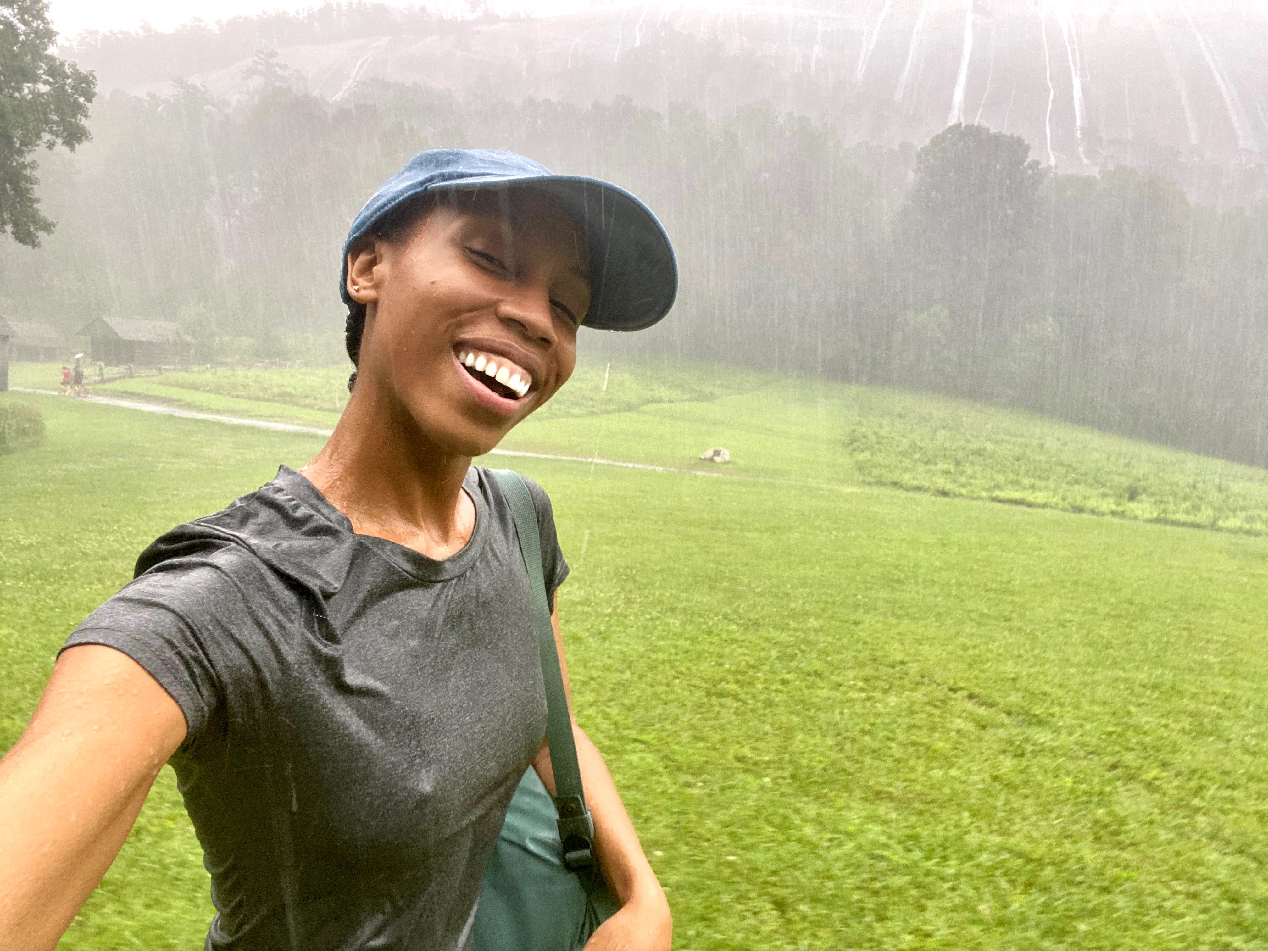 There was no where to hide from the rain to take a moment and collect ourselves. As we continued on we came across this opening, this huge beautiful opening! To the left was this grand view of Stone Mountain. Or at least one of the largest slabs of stone that the park consists of. I dare say the rainfall made it even more worthwhile.