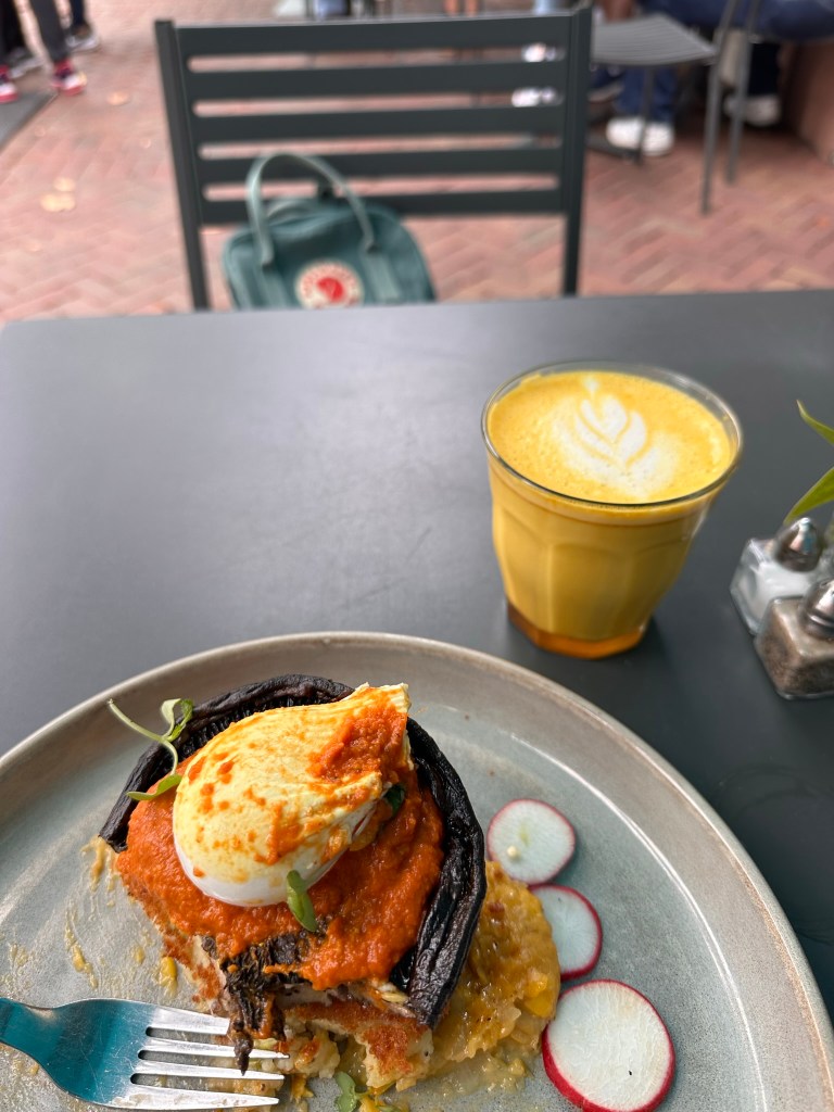 I was en route to Collins Quarter (about 12 minutes away), which I heard a lot about on social media. It’s known as a good spot for brunch! Once I arrived, I was promptly seated outdoors. I ordered the Bubble and Squeak which I thought was the cutest name for a dish, but also kind of strange 🙂 My dish was vibrant and caught the eyes of a few by-passers. I also ordered a turmeric latte to knock off the chill.