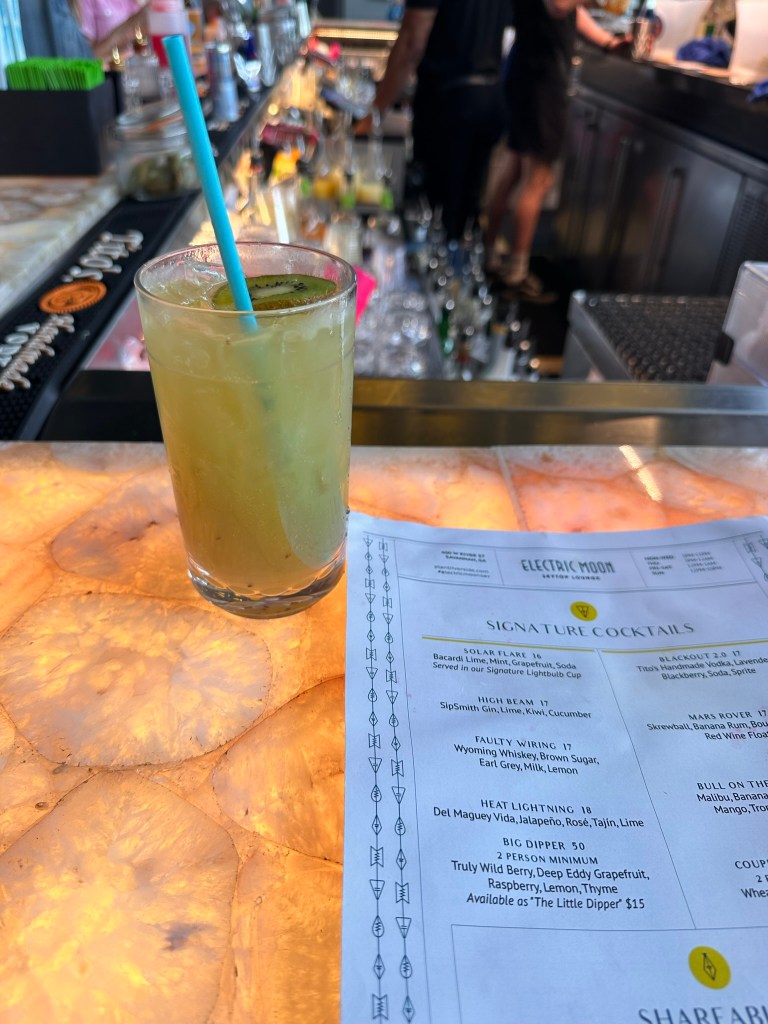 After seeing all that I could (gemstones, fossils, skeletons, artwork, mini shops), I decided to go to the rooftop bar called Electric Moon. I ordered the High Beam cocktail (loved it) and some mini quesadillas (not for sharing).