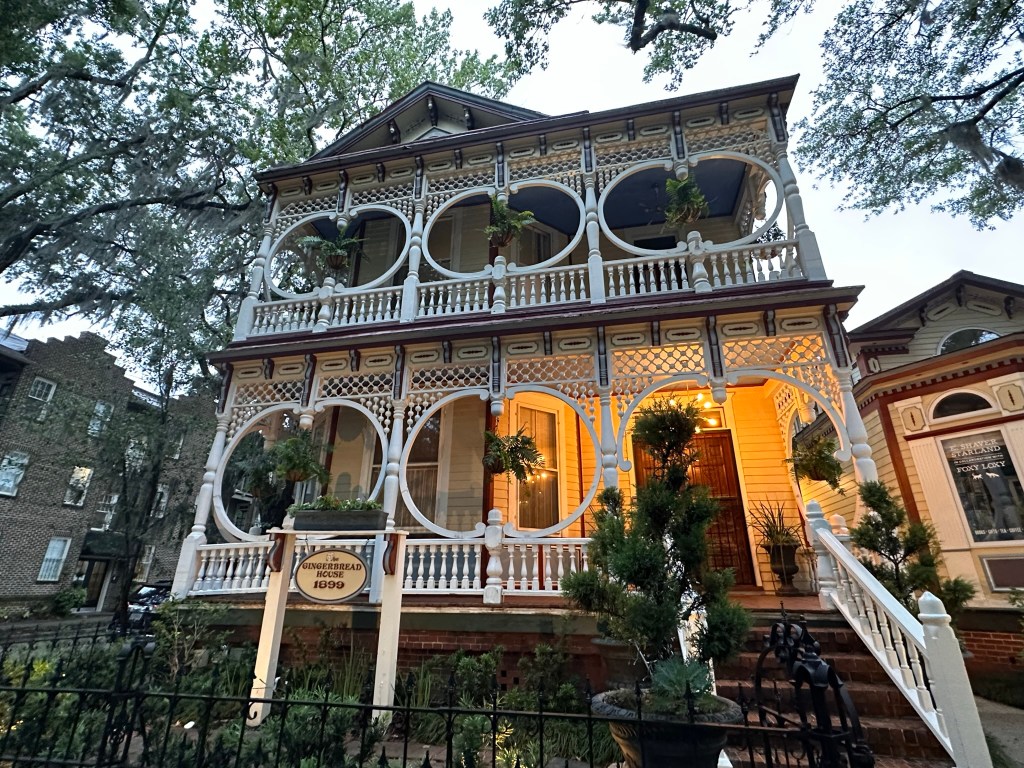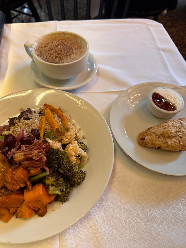 Up and at ‘em again but with a steady downpour, so no bike riding for me. I figured I’d start the day off with the SCAD museum. My favorite part was the glass-blown light fixtures. The pieces were so vibrant. It took about 35  minutes to go through the whole museum… I was a little disappointed because of how small it was… I had afternoon tea on my mind and saw that the Gryphon Tea Room was within walking distance so I hit the sidewalk! Not only was today wet and rainy but the temperature also dropped and I was ready to quickly get inside. My wait time was about an hour but I knew if I left for a different location, I’d be resetting the clock for the same length. I didn’t mind so much because there was a cute little sofa available and I was able to shake off the chill. There was so much to take in once I got a good look around… the room was grand with warm welcoming tones and dim lighting. Once I was seated, I eventually ordered the root vegetable salad. Because the vegetables were roasted, I thought the salad would be a warm one, but it was cold, to my dismay. I also ordered a chai latte with oat milk and a raspberry scone. I’m not sure why I just didn’t get regular afternoon tea but next time…