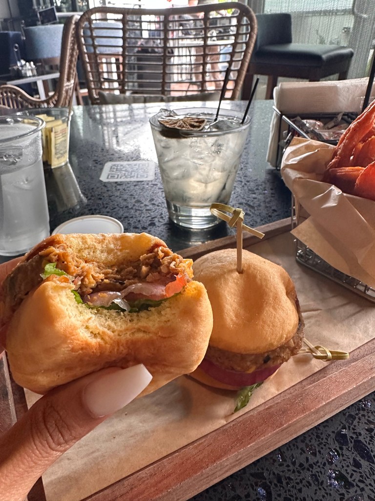 It took a while for my waitress to come over to me (not gonna lie, I was irritated), but when she finally took my order, she was pretty attentive. I was hard to miss, though! I was a party of one in the middle of the room so I’m not sure how that happened. Fast and Furious was playing on one of the flat screens until a man requested the golf channel which completely clashed with the whole vibe. That should not have been allowed! Anyway, I ordered the vegetable burger sliders with sweet potato fries and a mocktail (a light gingery drink). The Nest was my favorite eatery! I happily relaxed while taking in my environment and polished off each morsel.